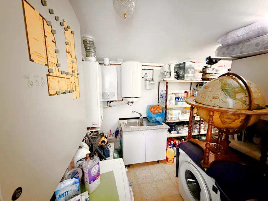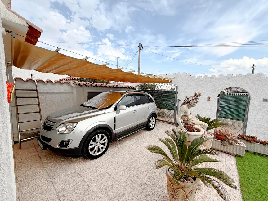 Upon entering, you access a spacious south-facing terrace with a pool and garage. The home includes three large bedrooms, highlighting a master suite, as well as two full bathrooms and a service area for guests. The spacious living room and fully equipped kitchen offer a functional and cozy environment.